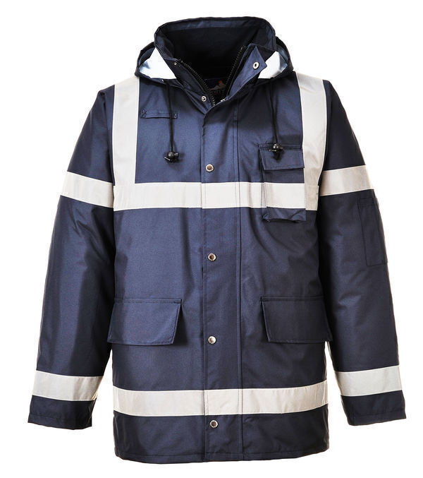 Parka. Coutures étanches. Fermeture centrale avec zip à double curseur. 6 poches, dont une poche téléphone cachée. Cordon de serrage. Bandes rétroréfléchissantes. Doublure matelassée.