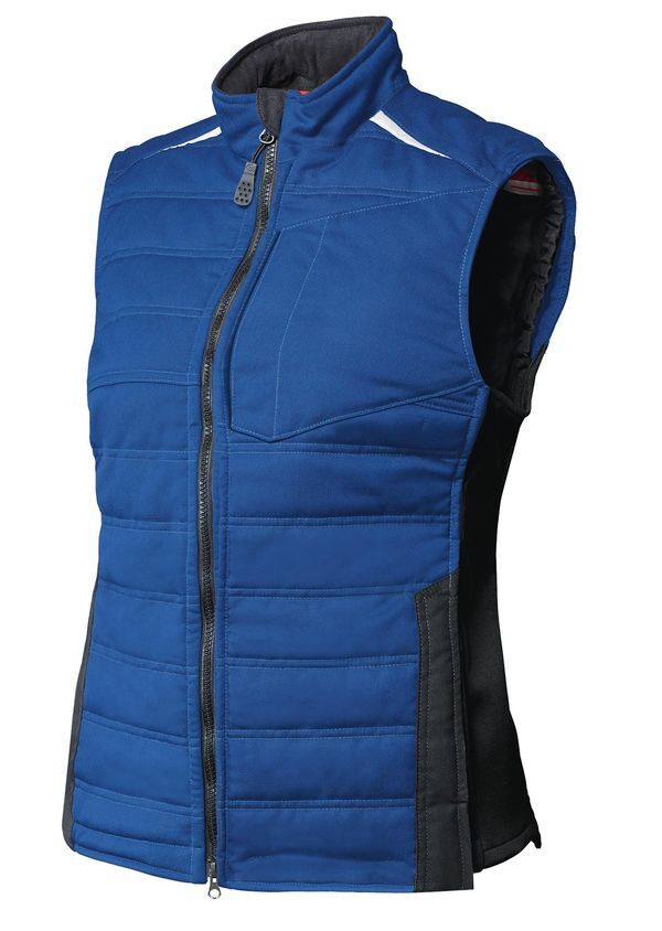 Doudoune sans manches ambulancier coupe femme. Col officier. Fermeture centrale à glissière double curseur sous patte. Poche poitrine fermeture bandes auto-agrippantes, grandes poches latérales avec fermeture à glissière. Éléments réfléchissants. Empiècements stretch sur les côtés. Bas de dos rallongé. Longueur : 76 cm.