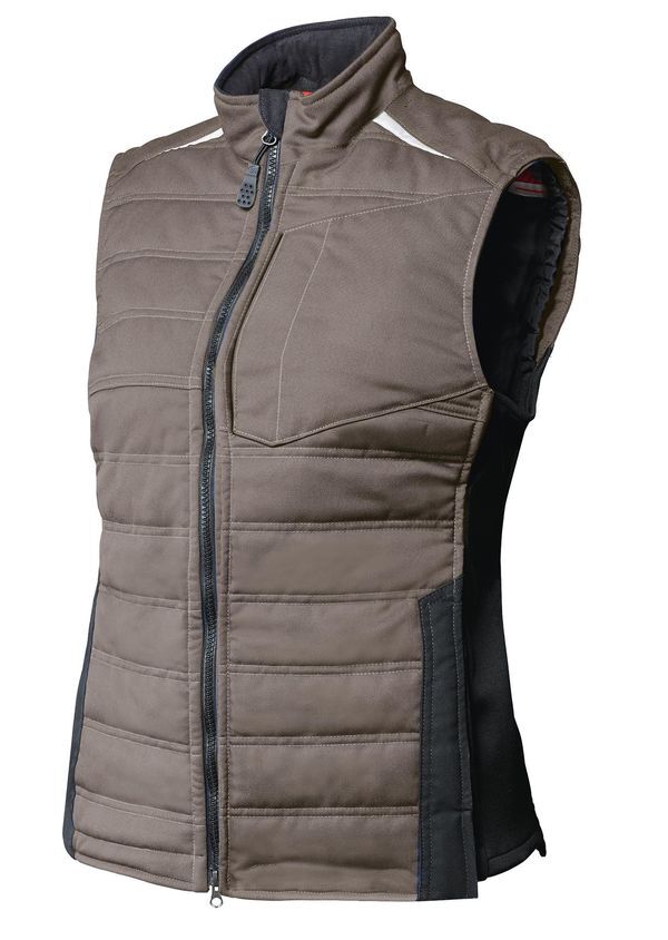 Doudoune sans manches ambulancier coupe femme. Col officier. Fermeture centrale à glissière double curseur sous patte. Poche poitrine fermeture bandes auto-agrippantes, grandes poches latérales avec fermeture à glissière. Éléments réfléchissants. Empiècements stretch sur les côtés. Bas de dos rallongé. Longueur : 76 cm.