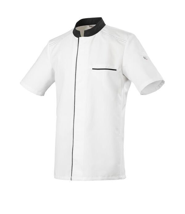 Veste de cuisine à col officier contrasté. Fermeture milieu devant par boutons-pression cachés, liseré contrasté. Poche poitrine avec liseré contrasté. Pinces poitrine. Côtés en maille. Manches longues avec poche stylo sur manche gauche et revers bas de manches contrastés.