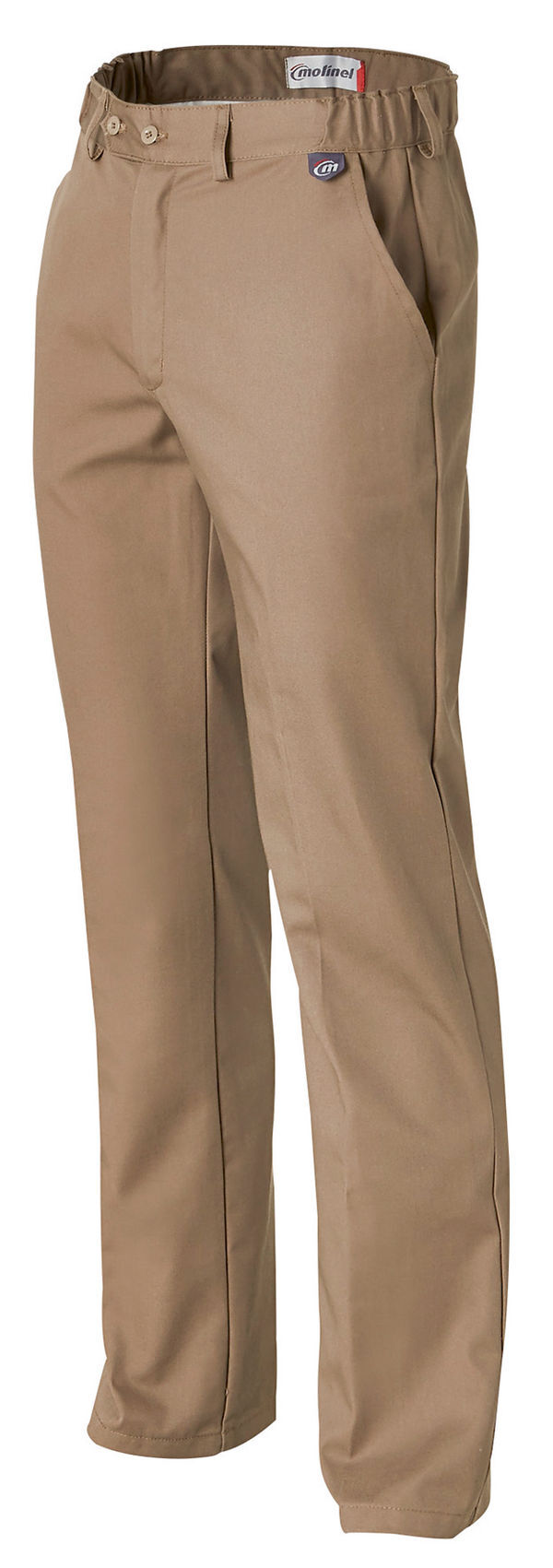 Pantalon homme. Ceinture élastiquée, braguette à glissière et double bouton. Plis devant. 2 poches biais devant. 1 poche passepoilée arrière. E.J. : 80 cm.