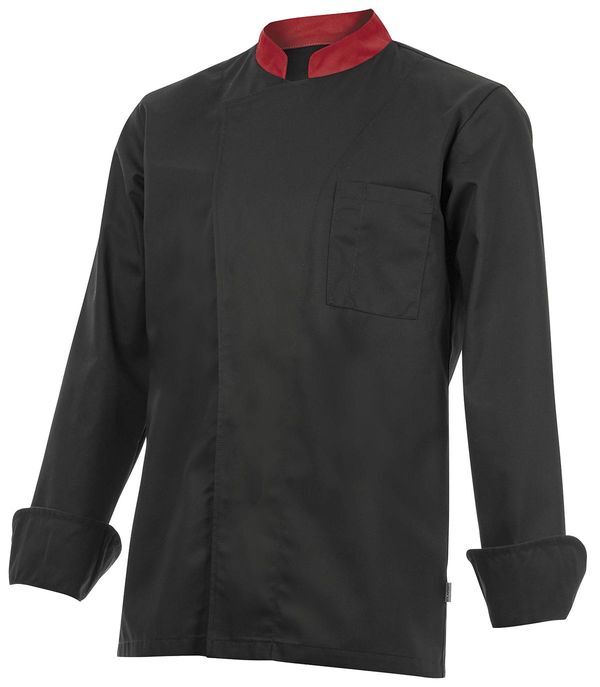 Veste de cuisine mixte à col officier. Fermeture asymétrique devant par boutons-pression cachés. Poche poitrine plaquée côté gauche avec compartiment stylo. Œillets d’aération. Manches longues. Poignets mousquetaires.