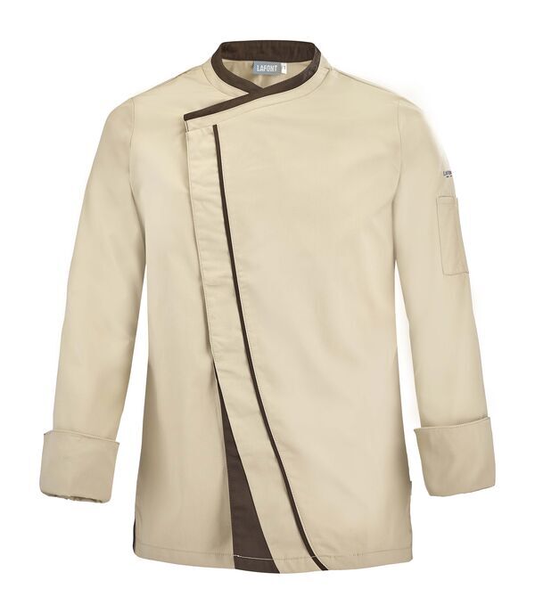 Veste homme à effet double col. Fermeture croisée par grippers cachés, double empiècement milieu dont angle bas contrasté et biais contrasté sur toute la hauteur. Fentes côtés renforcées par un twill jacquard. Oeillets d'aération brodés sous bras. Manches longues, poignets rapportés avec détails contrastés. Bas de manches à revers.