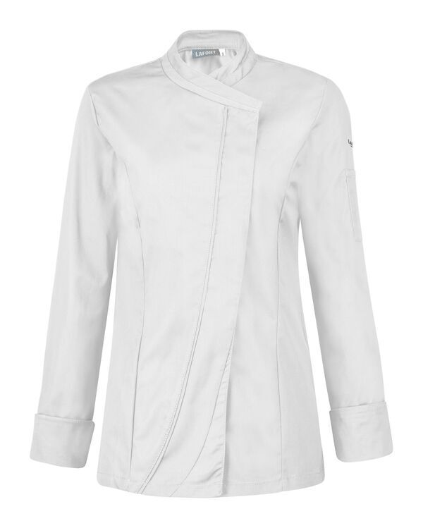 Veste femme à effet double col. Fermeture croisée par grippers cachés, double empiècement milieu dont angle bas contrasté et biais contrasté sur toute la hauteur. Découpes princesse sur devant et dos. Fentes côtés renforcées par un twill jacquard. OEillets d'aération brodés sous bras. Manches longues, poignets rapportés avec détails contrastés. Bas de manches à revers. Coupe ajustée.