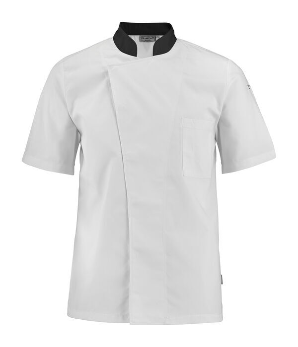 Veste de cuisine mixte à col officier. Fermeture asymétrique par boutons-pression cachés. Poche poitrine plaquée côté gauche avec compartiment stylo. Œillets d’aération. Manches courtes.