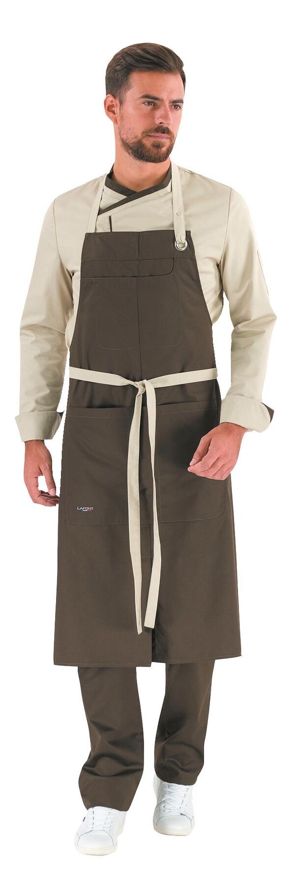 Tablier à bavette avec lien réglable autour du cou. Poche bavette et une grande poche ventrale double compartiment. Hauteur : 100 cm. Largeur : 95 cm.