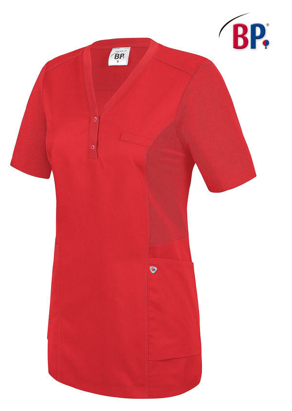 Tunique bi-matière à enfiler coupe femme. Encolure en V avec patte de boutonnage 2 boutons-pression. Empiècements en piqué extensibles sous les aisselles, 2 grandes poches latérales dont 1 avec poche pour bip, passant pour badge. Coupe ajustée. Manches courtes. Longueur : 68 cm.