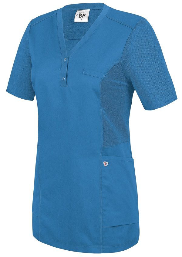 Tunique bi-matière à enfiler coupe femme. Encolure en V avec patte de boutonnage 2 boutons-pression. Empiècements en piqué extensibles sous les aisselles, 2 grandes poches latérales dont 1 avec poche pour bip, passant pour badge. Coupe ajustée. Manches courtes. Longueur : 68 cm.
