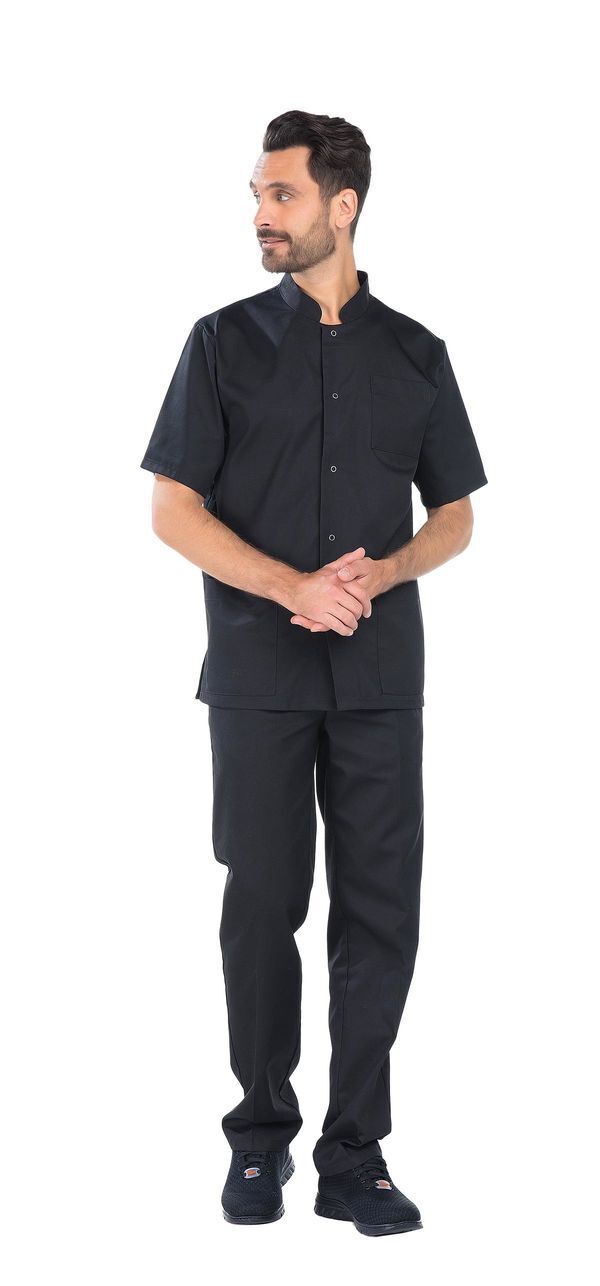 Tunique mixte. Col mao. Fermeture milieu devant par boutons-pression. 2 poches basses. Poche poitrine. Manches courtes. Fentes côtés. Longueur : 75 cm.
