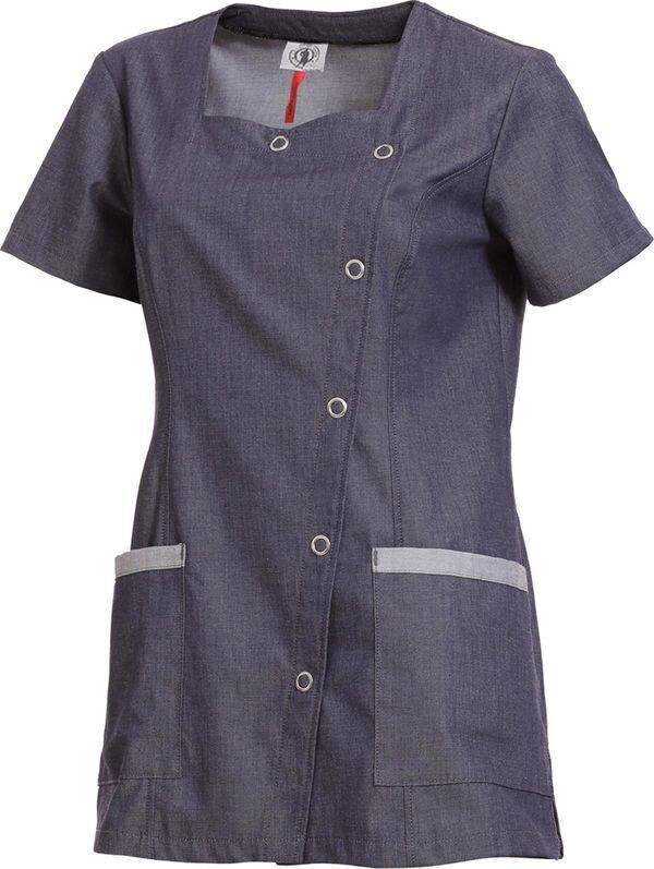 Tunique coupe femme. Encolure fantaisie. Découpes princesse devant et dos. Empiècement devant et carrure dos. 1 poche téléphone côté droit et 1 poche stylo côté gauche dans poches basses. 2 poches basses avec parement envers denim. Manches courtes. Fentes côtés. Longueur : 76 cm (selon taille).