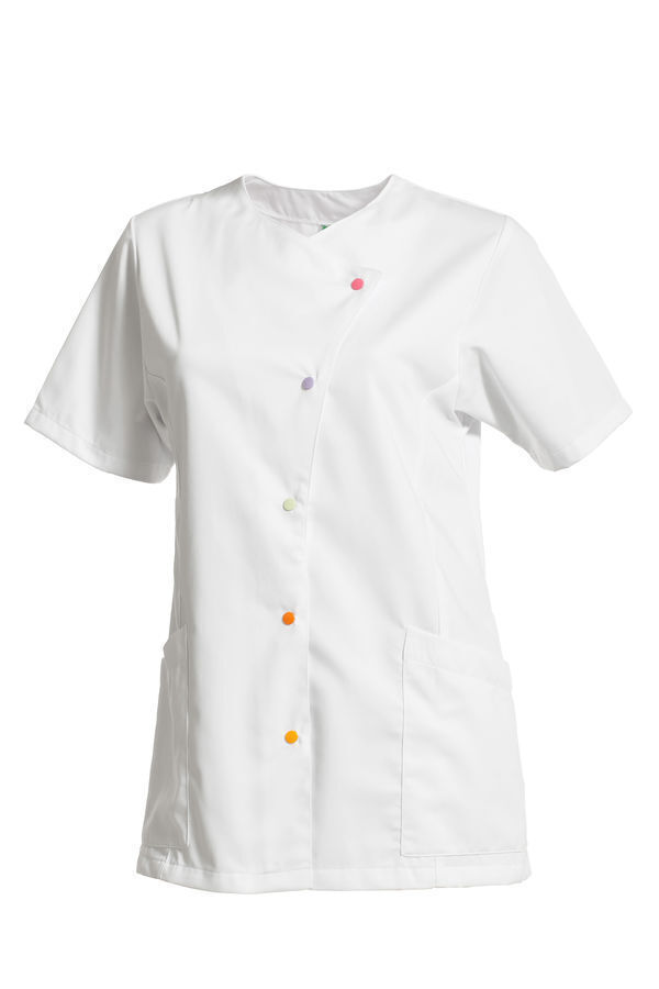 Tunique femme. Encolure fantaisie. Fermeture asymétrique par 5 pressions multicolores. 2 poches basses plaquées. Manches courtes montées. Longueur : 75 cm.