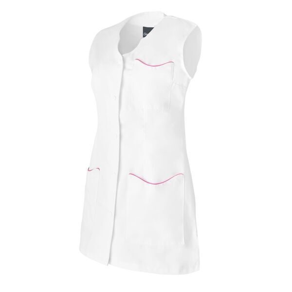 Tunique femme. Encolure fantaisie ton sur ton. Fermeture milieu devant par 5 pressions ton sur ton. 2 poches basses plaquées avec passepoil contrasté. Sans manches. Coupe cintrée. Longueur : 80 cm.