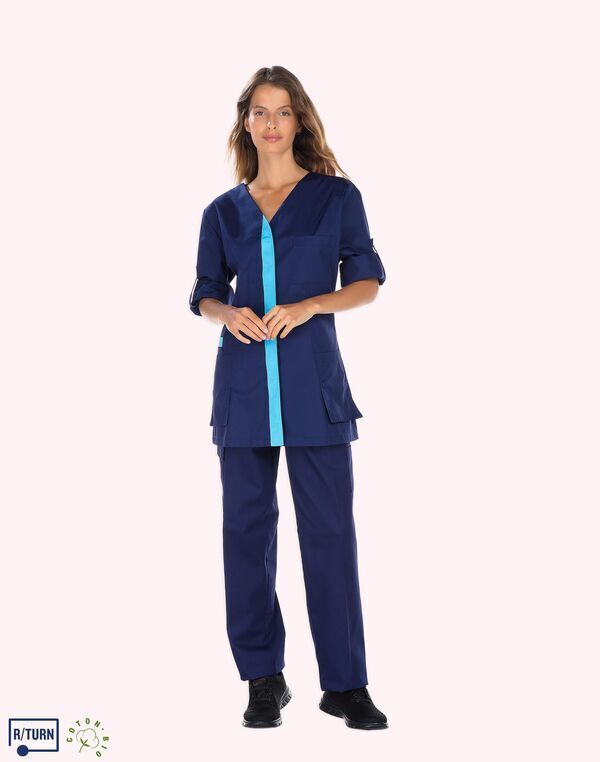 Tunique encolure V. Fermeture milieu devant par boutons-pression, parement contrasté. Découpe de cintrage. Poche poitrine, poche BIP. 2 poches basses semi-volantes. 2 fentes dos. Longueur : 75 cm.