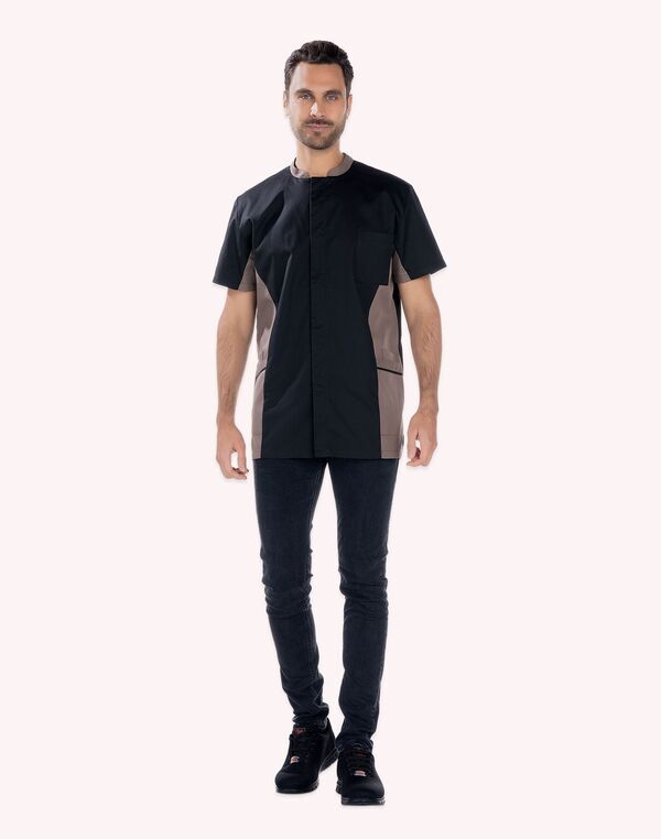 Tunique homme, col mao. Fermeture milieu devant par boutons-pression sous patte. Poche poitrine, 2 poches BIP, 2 poches basses dans découpe coté. Col et côtés contrastés. Manches courtes. Fentes cotés. Longueur : 78 cm.