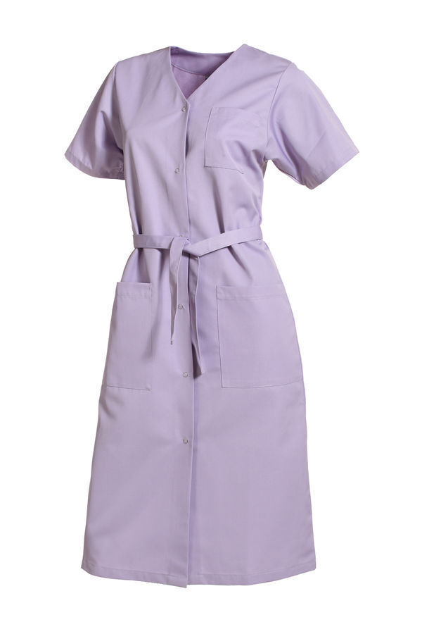 Blouse femme encolure V. Fermeture milieu devant par 6grippers. Ceinture amovible. Poche poitrine et 2 poches basses plaquées. Manches courtes avec pattes pressionnées. Longueur : 110 cm.
