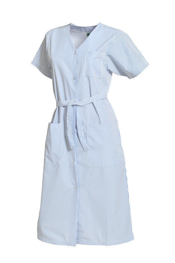 Blouse femme encolure V. Fermeture milieu devant par 6grippers. Ceinture amovible. Poche poitrine et 2 poches basses plaquées. Manches courtes avec pattes pressionnées. Longueur : 110 cm.