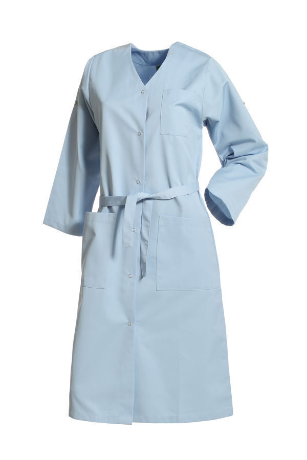 Blouse femme encolure V. Fermeture milieu devant par 6 grippers. Ceinture amovible. Poche poitrine et 2 poches basses plaquées. Manches transformables avec pattes pressionnées. Longueur : 105 cm.