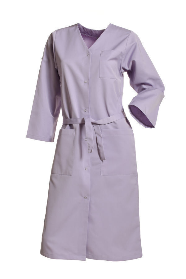 Blouse femme encolure V. Fermeture milieu devant par 6 grippers. Ceinture amovible. Poche poitrine et 2 poches basses plaquées. Manches transformables avec pattes pressionnées. Longueur : 105 cm.