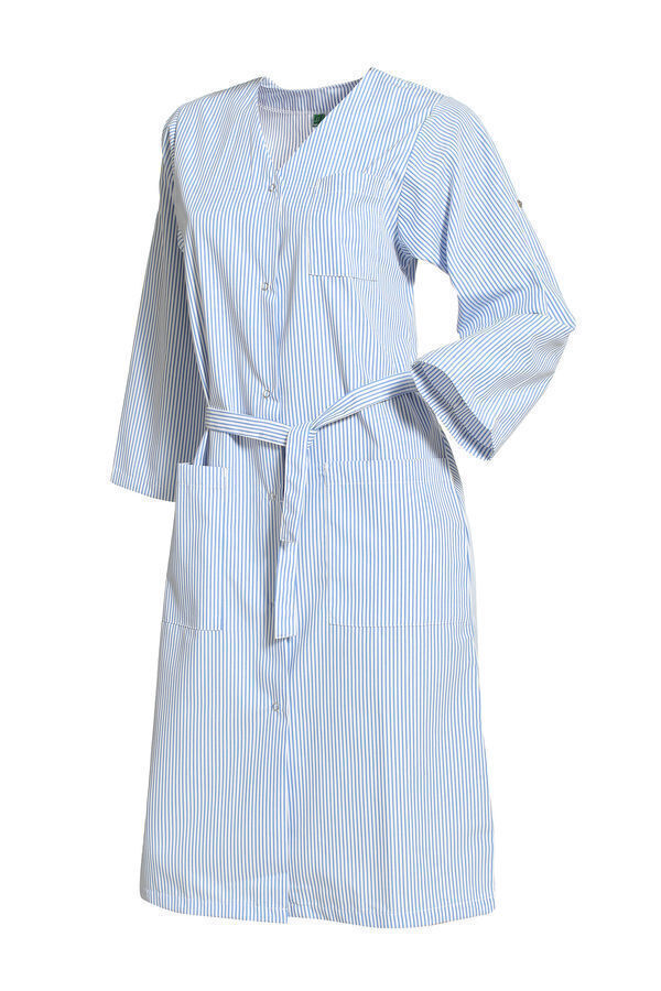 Blouse femme encolure V. Fermeture milieu devant par 6 grippers. Ceinture amovible. Poche poitrine et 2 poches basses plaquées. Manches transformables avec pattes pressionnées. Longueur : 105 cm.