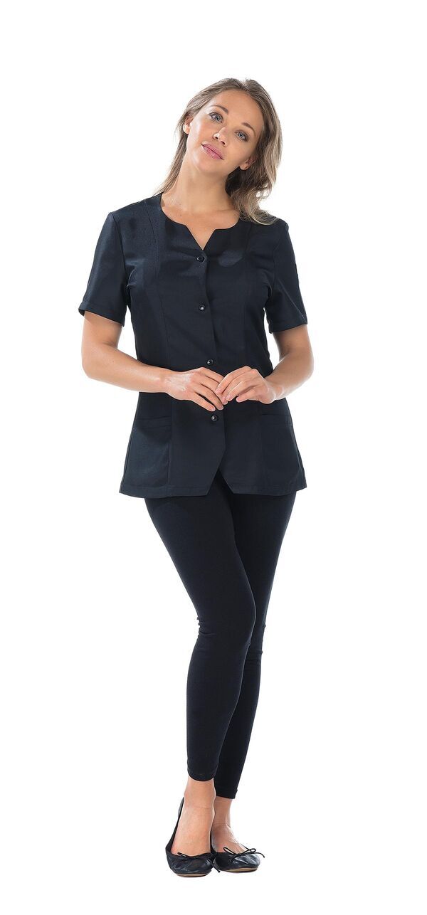 Tunique encolure ronde avec léger V. Fermeture milieu devant par pressions. Manches courtes. 2 poches plaquées, 1 poche stylo. Coupe ajustée. Longueur 70 cm.