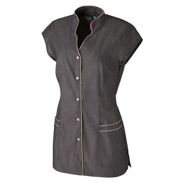 Tunique encolure fantaisie et parementure bordée d’un passepoil contrasté (sauf col noir). Fermeture par pressions apparentes milieu devant. Pinces devant, dos et poitrine. 2 poches basses avec passepoils contrastés. Petites manches. Fentes côtés. Longueur : 75 cm.