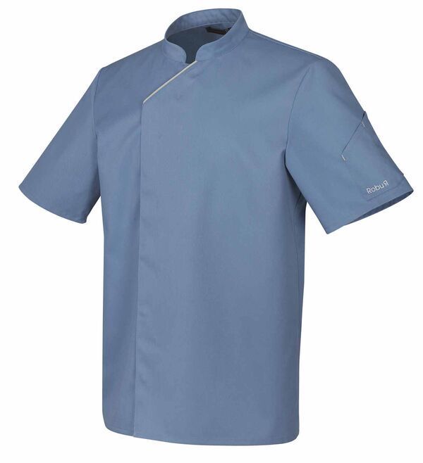 Veste mixte à col mao. Fermeture asymétrique par boutons-pression cachés. Liseré écru en haut du devant gauche. Manches courtes. Poche stylo plaquée sur manche gauche.