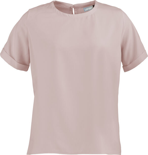 Top fluide entièrement doublé. Encolure ronde. Décolleté dos avec goutte. Manches courtes avec petit revers.