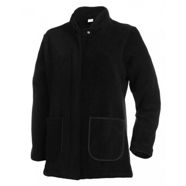 Passe-couloir polaire femme. Col montant. Fermeture milieu devant par 5 boutons-pression calottées ton sur ton. 2 poches basses. Manches longues montées. Longueur : 78 cm.