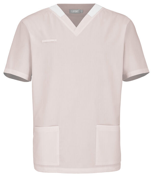 Tunique à enfiler mixte. Encolure V contrastée, collerette de marquage intérieur. 2 poches basses passepoilées. Passant porte-badge. 2 fentes côtés. Manches courtes. Longueur : 75 cm.