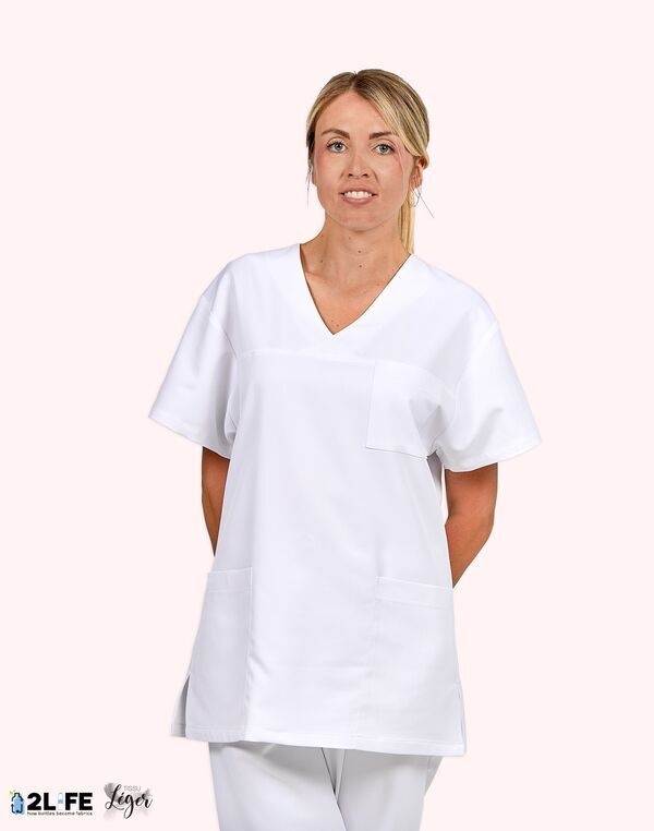 Tunique mixte encolure V. Poche poitrine, 2 poches basses. Fentes côtés. Manches courtes. Longueur : 75 cm.