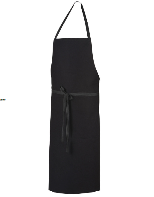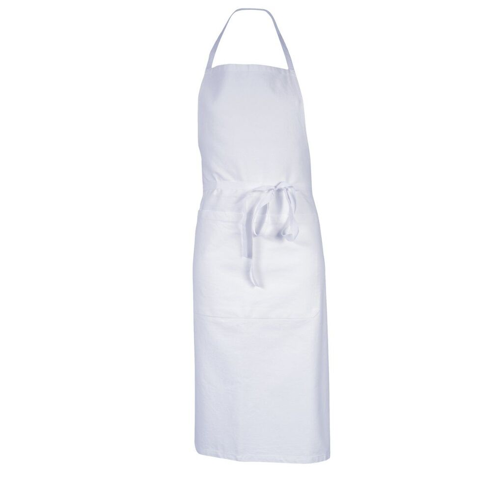 Tablier à bavette. Lien d’attache sur les côtés : 100 cm. Lien cou fixe : 60 cm. Grande poche centrale avec compartiment. Hauteur : 100 cm. Largeur : 105 cm.