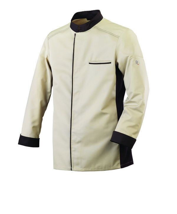 Veste de cuisine à col officier contrasté. Fermeture milieu devant par boutons-pression cachés, liseré contrasté. Poche poitrine avec liseré contrasté. Pinces poitrine. Côtés en maille. Manches longues avec poche stylo sur manche gauche et revers bas de manches contrastés.