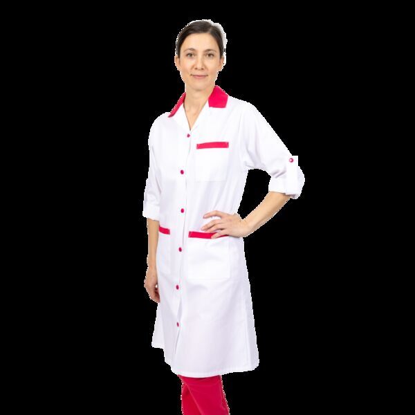 Blouse femme. Col tailleur contrasté. Fermeture milieu par 6 pressions calottées. Manches longues transformables. 2 poches basses plaquées + parement contrasté, 1 poche poitrine + parement contrasté. Longueur : 100 cm.