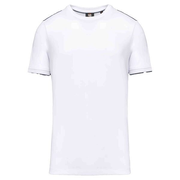 T-shirt homme. Col rond avec élasthanne. Manches courtes. Finition bas de manche en bord-côte. Finition double aiguille bas de vêtement. Liserés contrastants épaules et bas de manches.