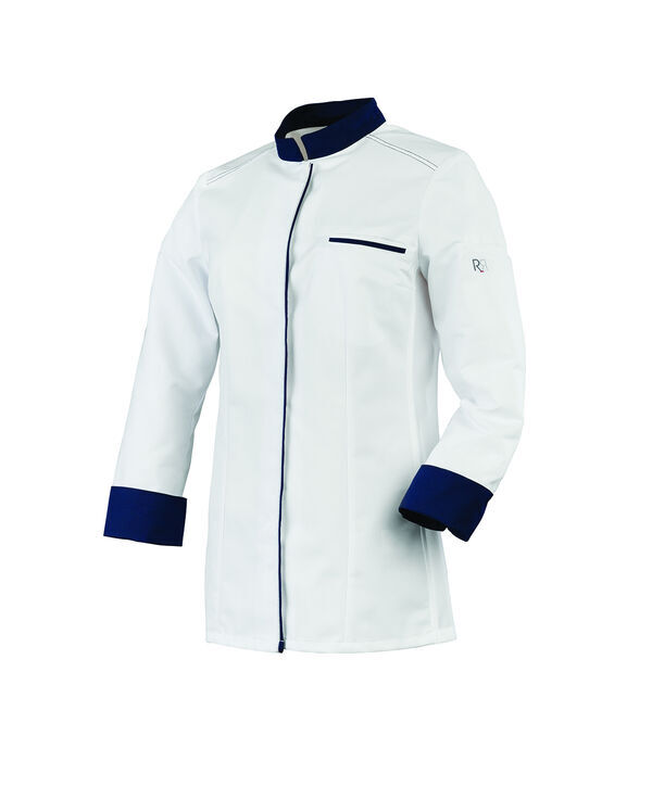 Veste de cuisine femme à col officier contrasté. Fermeture milieu devant par bouton-pression cachés, liseré contrasté. Poche poitrine avec liseré contrasté. Pinces poitrine. Côtés en maille. Manches longues avec poche stylo sur manche gauche et revers bas de manches contrastés. Coupe ajustée.