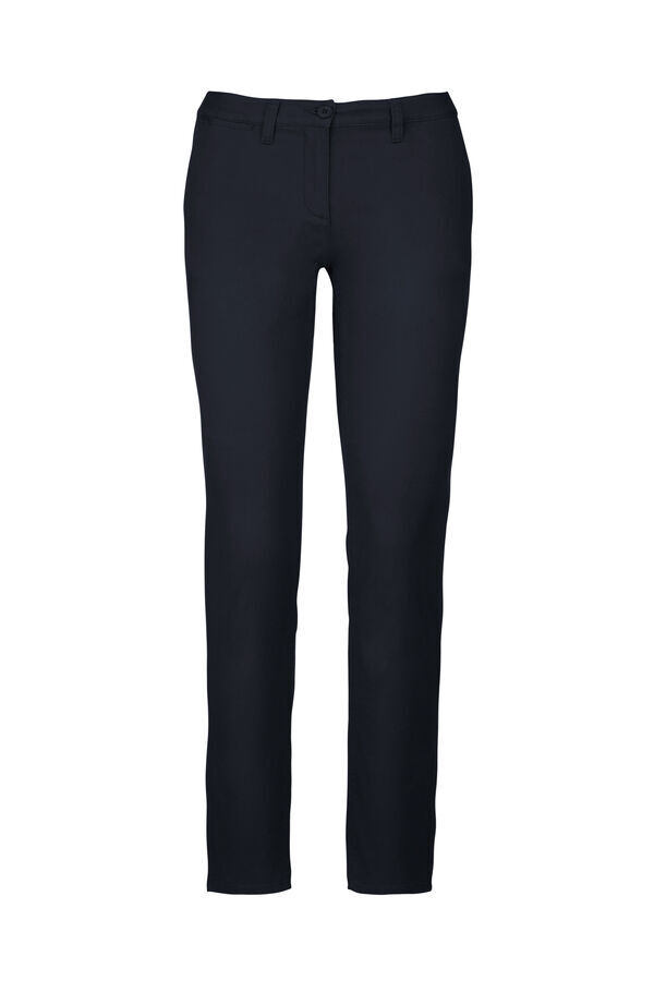 Pantalon chino, coupe femme. Fermeture braguette zippée et bouton cousu. Ceinture avec passants. 2 poches italiennes côtés, dont une avec 1 poche monnaie, 1 poche ticket. 2 poches arrières passepoilées avec piqûre de renfort. Coupe moderne. Finition enzymes.