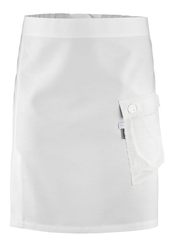 Tablier demi-chef. Poche contrastée en bas à gauche avec pinces volume. Serrage taille par cordon. Fente côté droit. Hauteur : 53 cm. Largeur : 97 cm.