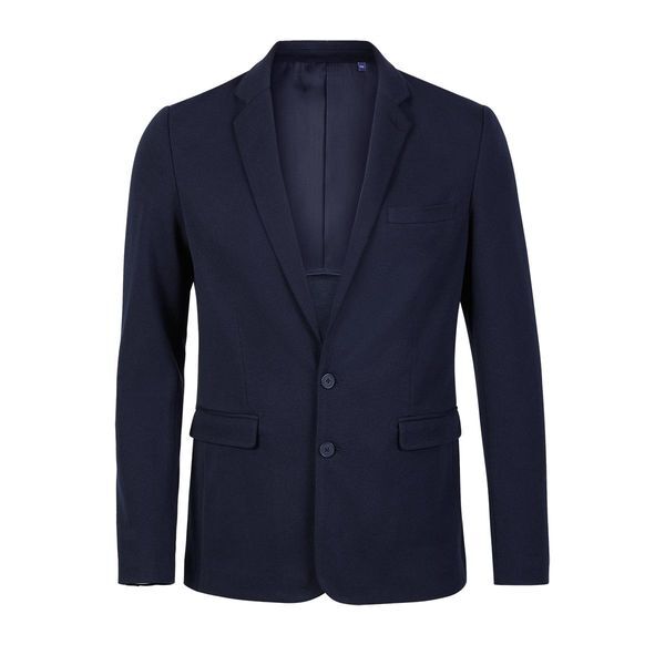 Blazer maille piquée homme. Col tailleur. Fermeture par 2 boutons. 2 poches passepoilées à rabat. 1 poche poitrine. Fente milieu dos. Semi-doublé.