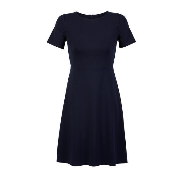 Robe midi. Encolure ronde. Découpe taille. Fermeture milieu dos zip invisible. Manches courtes.