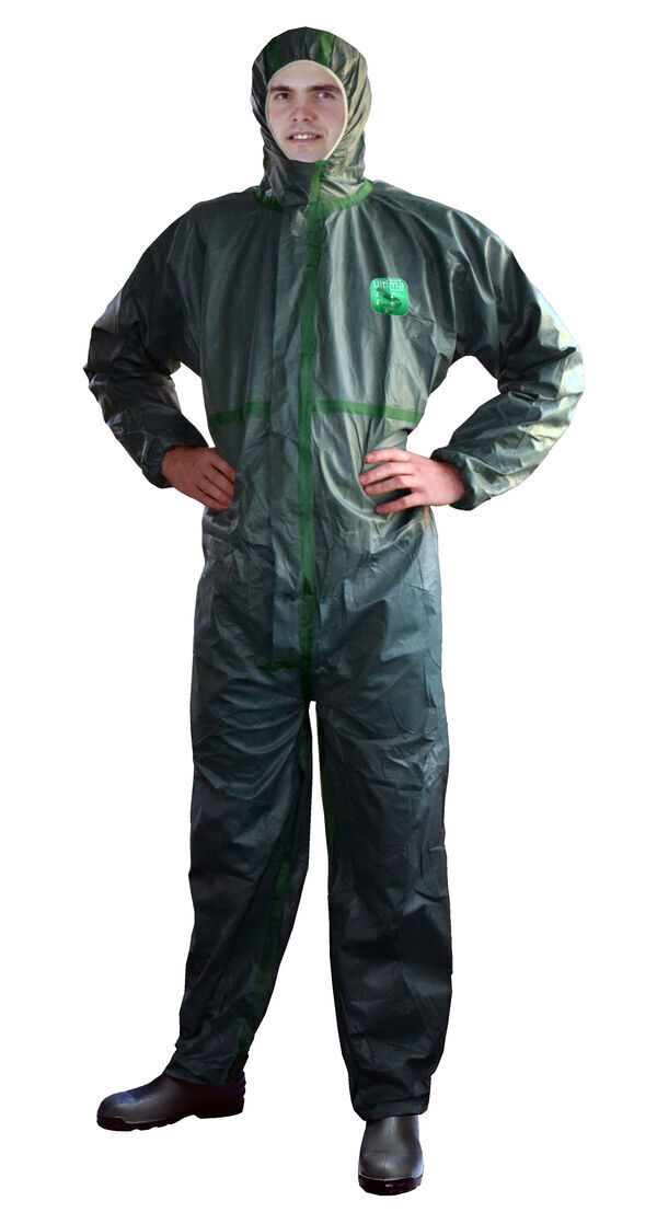 Combinaison avec capuche élastiquée en 3 parties. Taille, chevilles et poignets élastiqués. Fermeture à glissière avec rabat adhésif. Coutures recouvertes par un film vert. Passe-pouces élastiqués. Existe en blanc : CM4X