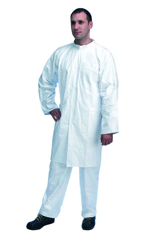 Blouse de protection. Col officier. Fermeture par boutons-pression. Deux poches plaquées cuisse, une poche poitrine. Manches longues droites. Protège des éclaboussures de produits liquides. Perméabilité à l’air et à la vapeur d’eau. Matériau non-pelucheux et exempt de silicone, de contaminants, de produits de remplissage et de liants.