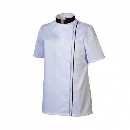 Une veste de cuisine de coupe féminine facile d'entretien dont le col et le liseré vertical en couleur confèrent un look moderne.