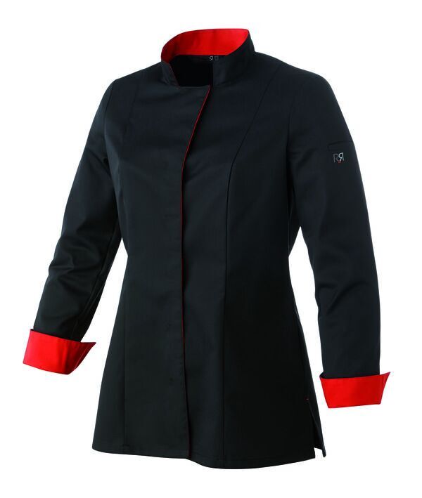 Veste cintrée femme à col officier ou ouvert avec intérieur contrasté et bouton cousu. Fermeture milieu devant par pressions cachées. Découpes bretelles avec 2 soufflets d'aisance dos avec intérieur contrastés. Poche stylo sur manche. Manches longues, œillets d'aération sous les bras. Bas de manches fendus avec intérieur contrasté. Fentes côtés. Coupe cintrée.