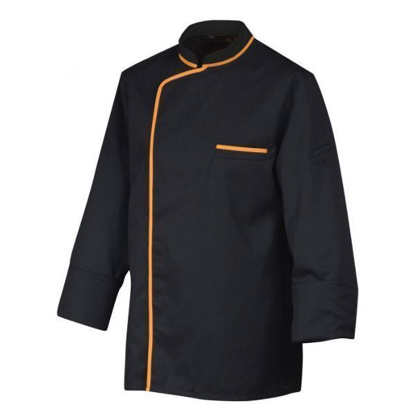 Col officier Boutons pressions cachés Liseré contrasté: col + plastron + poche poitrine Bande en maille respirante sur les côtés Poche stylo sur manche
