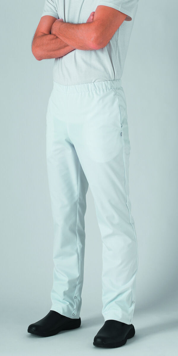 Pantalon mixte. Ceinture élastiquée. 2 poches italiennes. Bas de jambe réglable par pressions sur 2 positions.