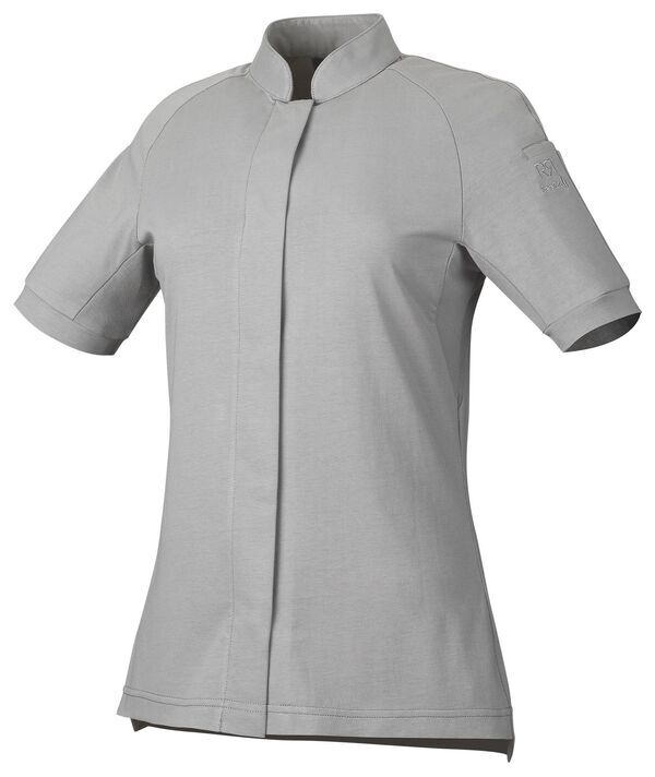Veste de cuisine en maille Seacell® à col mao. Fermeture milieu devant par boutons-pression cachés. Manches courtes raglans, finition par bracelet rapporté. Poche passepoilée sur manche gauche. Veste entièrement en maille.