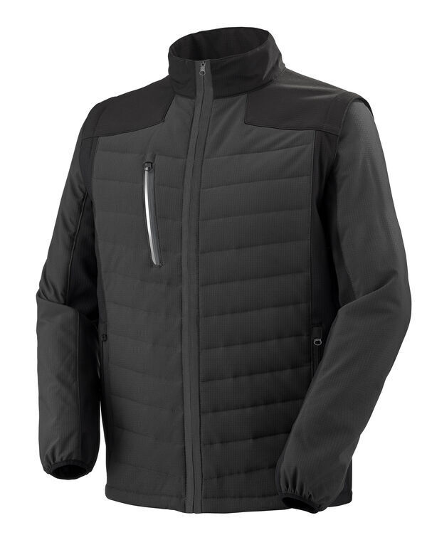 Veste hybride bi-matière softshell. Col montant. Fermeture centrale zippée. Poche poitrine zippée. Poches côtés à fermeture à glissière inversée. Réglage bas de veste par cordon élastiqué et stoppeur. Matelassage sur l'avant et le dos. Manches amovibles. Finition bas de manches élastiquée. Dos rallongé. | Point d'attache au col et bas de manche avec système modul'wear.