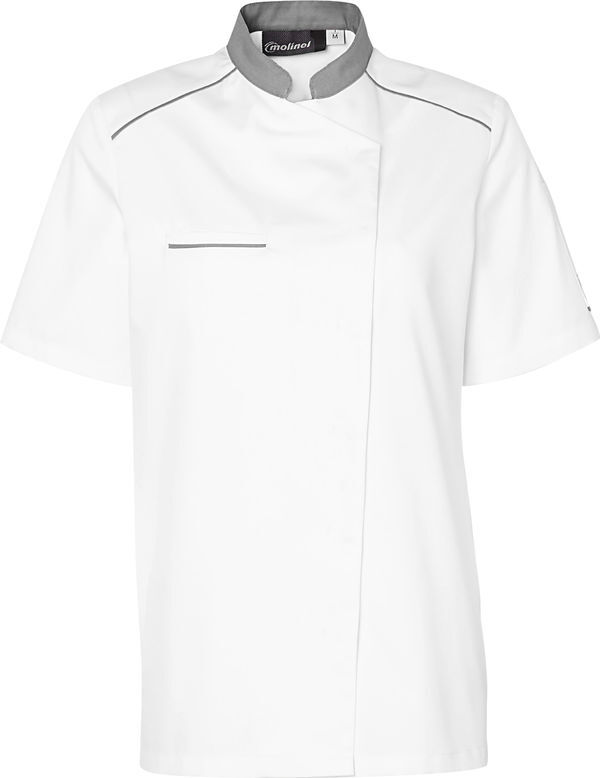 Veste femme col officier contrasté. Fermeture devant par 7 pressions cachées. 1 poche poitrine passepoilée. Empiècements épaules. Soufflet dos en maille respirante. Fentes côtés. Manches courtes. 1 poche stylo plaquée sur manche gauche. Empiècements sous bras en maille respirante. Passepoil contrastant : empiècements épaules devant et dos, bas de poche stylo, poche poitrine passepoilée.