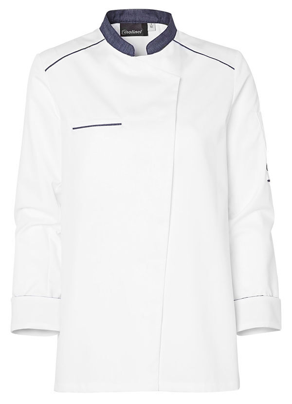 Veste femme à col officier contrasté. Fermeture devant asymétrique par pressions cachées. Poche poitrine passepoilée. Manches longues, poignets rapportés. Poche stylo plaquée sur manche gauche. Fentes côtés. Empiècements sous bras et dos en maille respirante. Passepoil contrasté aux épaules devant et dos, bas de poche stylo. Coupe regular. Maille double face alvéolée antibactérienne.