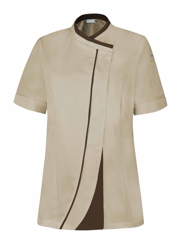 Veste femme à effet double col. Fermeture croisée par grippers cachés, double empiècement milieu dont angle bas contrasté et biais contrasté sur toute la hauteur. Découpes princesse sur devant et dos. Fentes côtés renforcées par un twill jacquard. OEillets d'aération brodés sous bras. Manches courtes. Bas de manches à revers. Coupe ajustée.